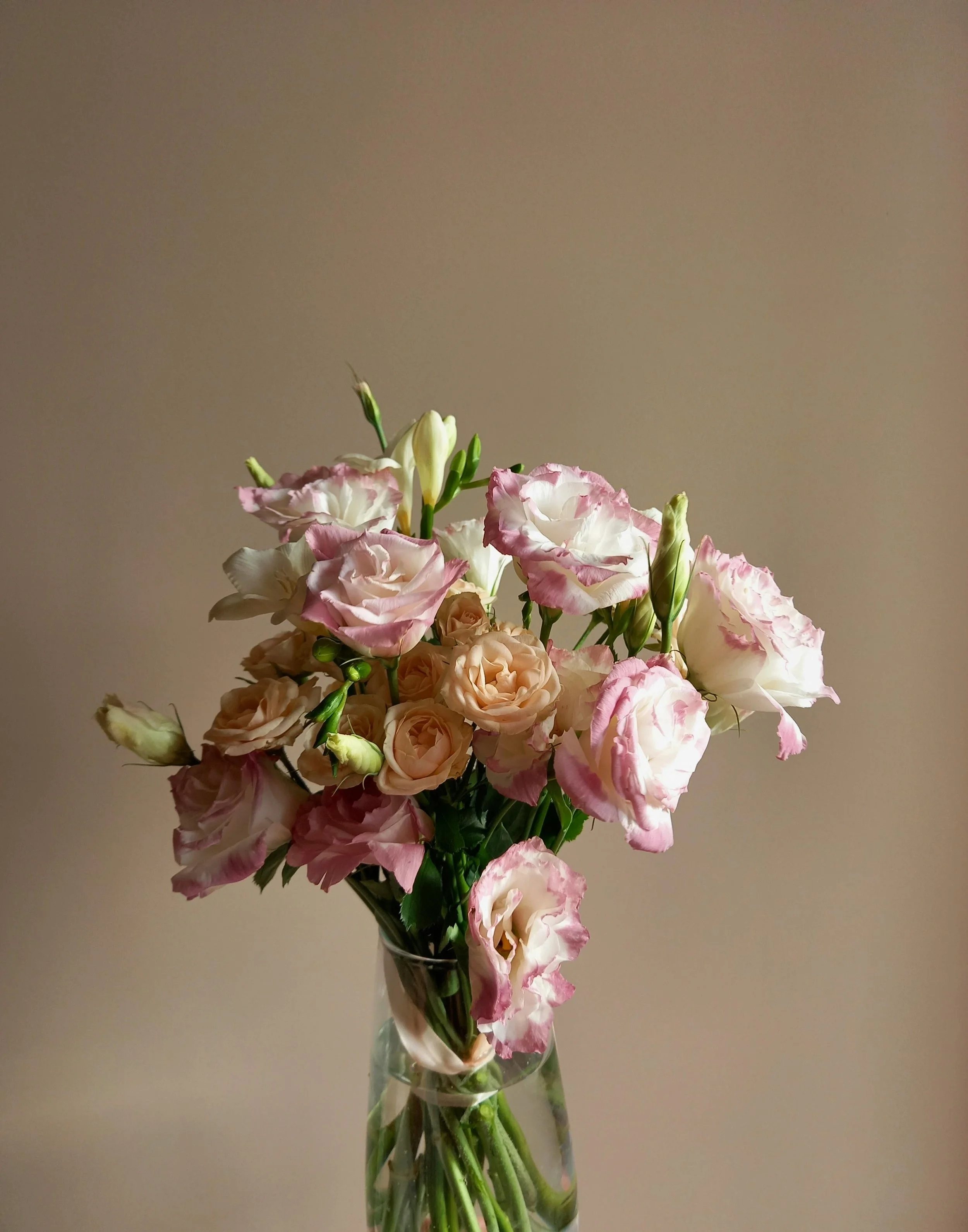 The entwinement of the soft blush of dawn breaking over lush meadowlands. Peachy pink hues melt into tender rose tones, while verdant touches whisper of morning dew and secret gardens. The composition breathes with gentle sophistication, each element harmonizing to create a dreamscape of pastoral beauty. This Ellermann Flowers collection embrace the quiet poetry of nature's most delicate moments, wrapped in understated luxury.